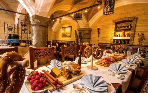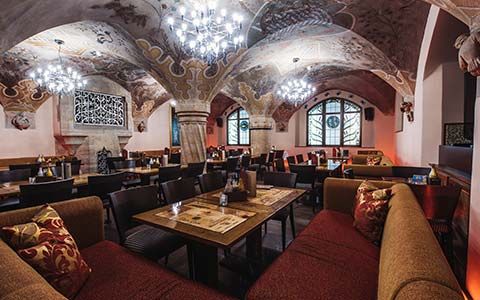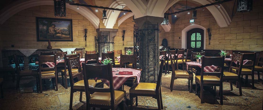 Die sechs Kreuzgewölbe des Arche Noah Gewölbes erzählen (gemalt in den 20iger Jahren des letzten Jahrhunderts) in achtundvierzig Darstellungen die Geschichte des Genusses in Verbindung mit Weintrinken. Außerdem das Hauptgemälde an der Stirnseite der Arche Noah, als Noah mit seiner Arche auf dem Berg Ararat strandet und seine Tierpaare entlässt. Weiter das vermutlich berühmteste Gemälde von Heinrich Schlitt: „Schlacht der Bierkrüge gegen die Champagnerflaschen“.