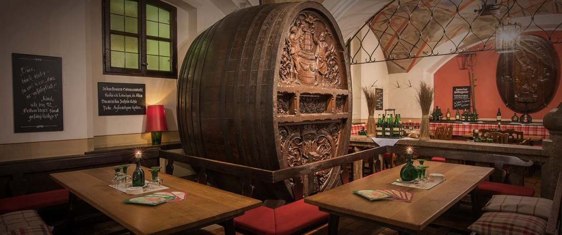 Die sechs Kreuzgewölbe des Arche Noah Gewölbes erzählen (gemalt in den 20iger Jahren des letzten Jahrhunderts) in achtundvierzig Darstellungen die Geschichte des Genusses in Verbindung mit Weintrinken. Außerdem das Hauptgemälde an der Stirnseite der Arche Noah, als Noah mit seiner Arche auf dem Berg Ararat strandet und seine Tierpaare entlässt. Weiter das vermutlich berühmteste Gemälde von Heinrich Schlitt: „Schlacht der Bierkrüge gegen die Champagnerflaschen“.