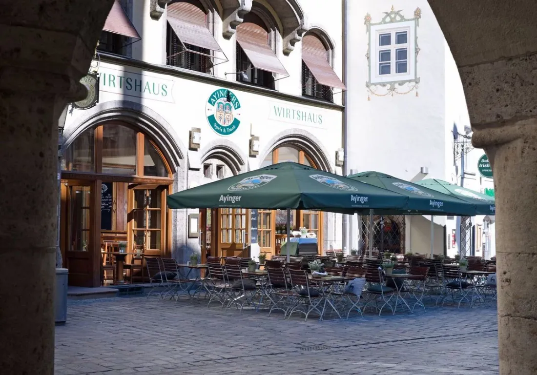 In diesem Münchner Wirtshaus wird bayerische Bier- und Braukunst besonders hochgehalten. Schließlich werden im Ayinger am Platzl die familieneigenen süffigen Spezialitäten präsentiert - die Biere der Ayinger Privatbrauerei mit über 140-jähriger Tradition. Acht verschiedene Biere werden täglich frisch vom Fass angezapft. Dazu gibt es im gepflegten modern-bayerischen Gasthaus regionale Küche: ganz klassisch zubereitet nach den Rezepten des seit Generationen überlieferten Familienkochbuchs sowie auch kreativ interpretiert. Im hinteren Wirtshausbereich kann man in der grünen Jagdstube einkehren. Sitzt man an den Hochtischen an der Fensterfront, die sich auch öffnen lässt, hat man freien Blick hinüber zum Hofbräuhaus – wie auch von der Terrasse des Ayinger am Platzl.