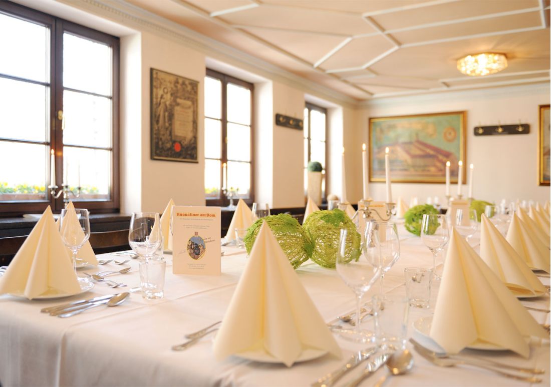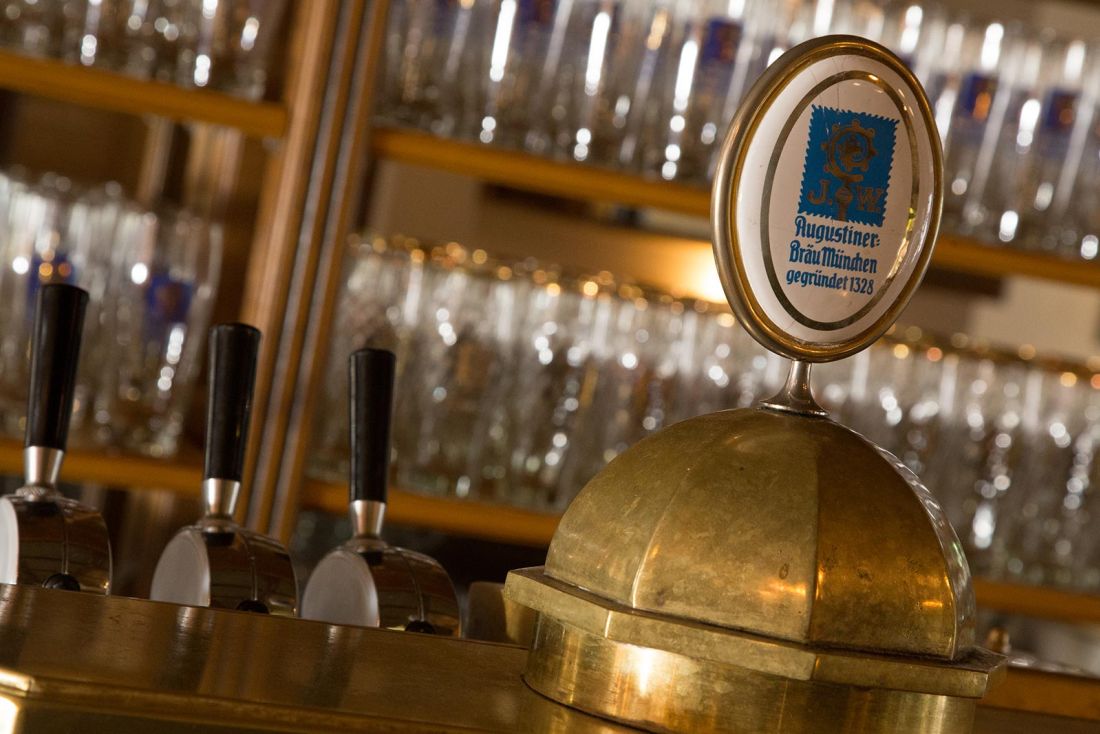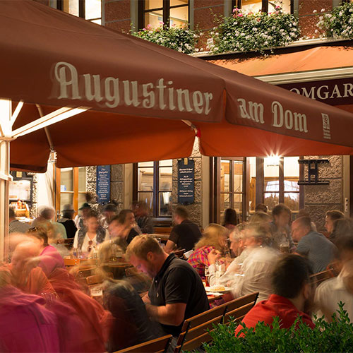 Nach guter alter Tradition wird die berühmte Münchner Weißwurst nur bis zwölf Uhr mittags serviert. Im Augustiner am Dom hält man an diesem Brauch fest – und dass man hier die Zeit übersieht, ist kaum möglich. Pünktlich um zwölf Uhr läuten schließlich die Domglocken der Frauenkirche direkt beim Wirtshaus. Dieses strahlt gemütliche Münchner Gastlichkeit aus: mit viel Holz, imposanten gusseisernen Säulen und einem kupferglänzenden Dach über der Bar, entstanden aus einem Braukessel. Die Küche sorgt in erster Linie für bayerische Schmankerl aus regionalen Produkten. Im Innenhof kann man im Domgarten einkehren, vor dem Wirtshaus auf der großen Terrasse. Außerdem gibt es in den beiden Obergeschossen verschiedene hübsche Stuben für Feierlichkeiten aller Art.