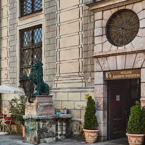 Diese besondere Einkehr residiert wahrlich hochherrschaftlich – in der ehemals königlich bayerischen Residenz. Der stattliche Viersäulensaal ist die historische Eingangshalle zu einstigen Gästezimmern des Stadtschlosses. Längst können hier auch ganz bürgerliche Gäste eintreten, verweilen und genießen, denn der große Saal und sechs weitere sehenswerte Stuben bilden die Pfälzer Residenz Weinstube. Unterhalten wird diese seit 1950 vom Landesverband der Pfälzer in Bayern zur Pflege pfälzischer Gastlichkeit und Weinkultur. In den Kellergewölben lagern rund 60.000 Flaschen. Die Küche bietet ein breit gefächertes Angebot. Besonders beliebt sind die Pfälzer Spezialitäten, beispielsweise Pfälzer Saumagen. Bei schönem Wetter kann man sich auch im prachtvollen Kaiserhof bewirten lassen.